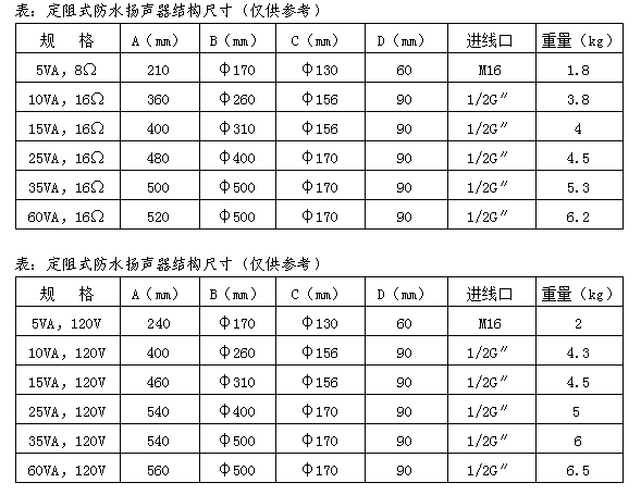 1.YH—5型是低阻負(fù)載防水揚(yáng)聲器,5VA的防水揚(yáng)聲器負(fù)載阻抗為8歐姆;10VA、15VA、25VA、35VA、50VA、60VA的防水揚(yáng)聲器負(fù)載阻抗為16歐姆。10VA、15VA、25VA防水揚(yáng)聲器也有負(fù)載阻抗為8歐姆。定阻式防水揚(yáng)聲器一般距離擴(kuò)音功放設(shè)備較近時(shí)使用。